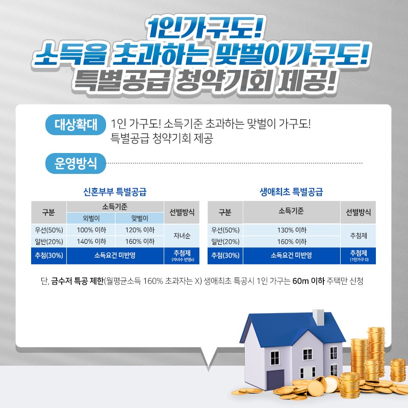 1인가구, 소득기준 초과자, 무자녀 신혼 등 특공 사각지대 보완