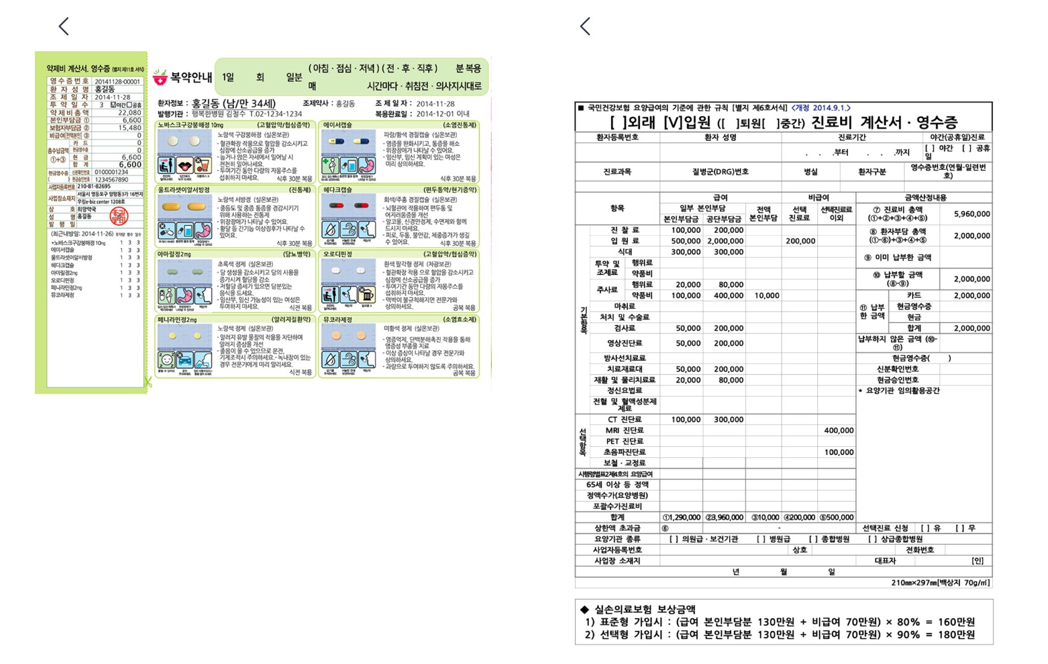 위 사진은 진료비 계산서 영수증, 약제비 영수증 샘플 입니다