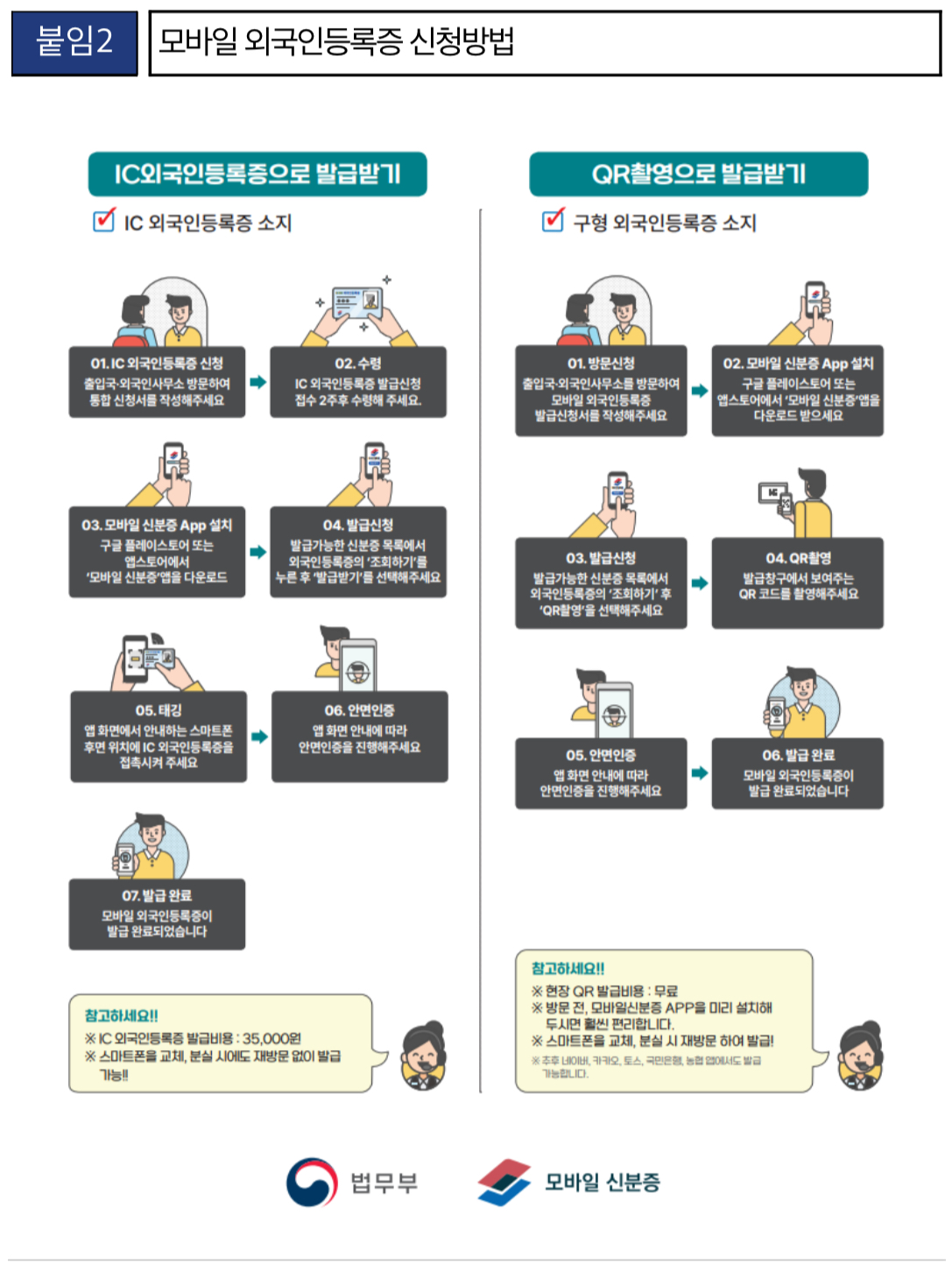 전자칩 내장 신형 외국인등록증을 소지한 경우에는 모바일신분증 앱을 이용하여 쉽게 모바일 외국인등록증을 발급받을 수 있으나, 기존 외국인등록증 소지자는 출입국‧외국인관서를 방문하여 스마트폰으로 신원확인 큐알(QR)코드를 촬영하여야만 발급이 가능합니다.