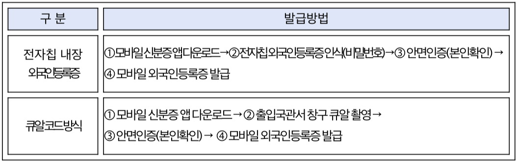 모바일 외국인등록증은 행정안전부에서 구축한 「국가 모바일신분증 통합플랫폼」의 ‘모바일신분증앱’을 본인 명의 스마트폰에 설치하여 발급받을 수 있으며 법무부는 모바일 외국인등록증 발급 편의를 위해 2025. 1.부터 개인식별번호(PIN)가 저장된 전자칩(IC) 내장 신형 외국인등록증을 발급하고 있습니다.