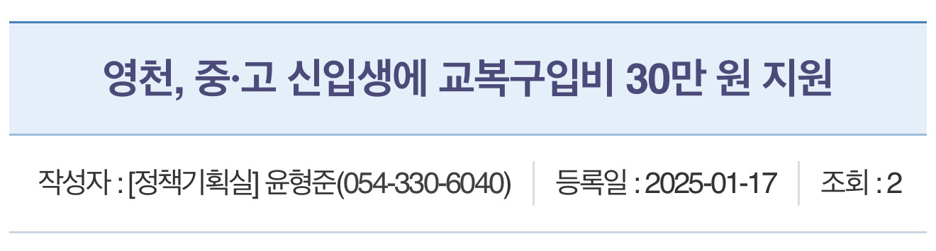 경북 영천시는 올해 입학하는 중·고등학교 신입생 학부모의 교육비 부담을 덜기 위해 교복구입비를 지원한다고 합니다.