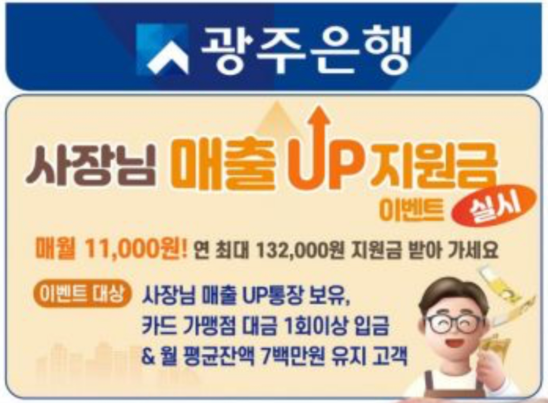 광주은행(은행장 고병일)은 개인사업자 비대면 전용상품인 '사장님 매출UP통장' 출시기념으로 ‘사장님 매출UP 지원금 이벤트'를 오는 2025년 6월까지 실시한다고 밝혔습니다.