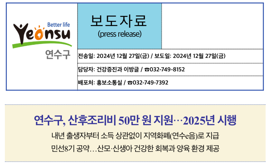 연수구(구청장 이재호)가 출산가정의 경제적 부담을 완화하고 안정적인 생활을 지원하기 위해 2025년부터 소득 수준과 관계없이 모든 출산가정에 50만 원의 산후조리비를 지원한다고 합니다.
