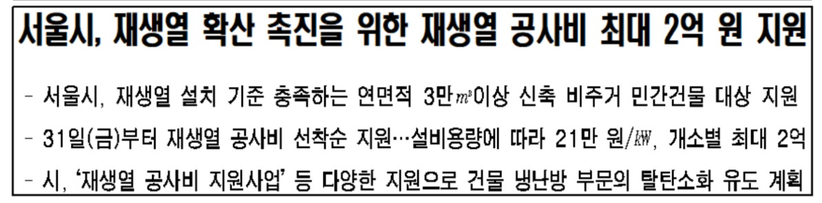 서울시는 연면적 3만㎡ 이상 비주거 신축건물의 지열, 수열 등 재생열 도입에 따른 공사비 부담을 경감하기 위해 ‘재생열 공사비 지원사업’을 추진한다고 합니다.