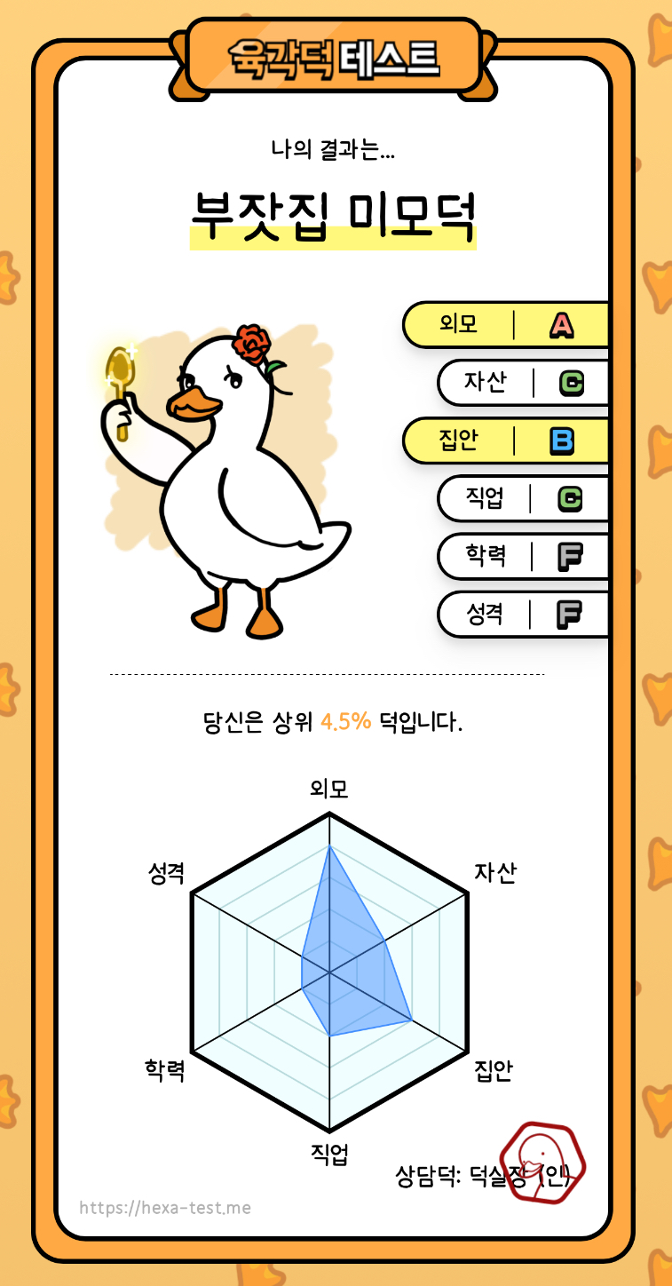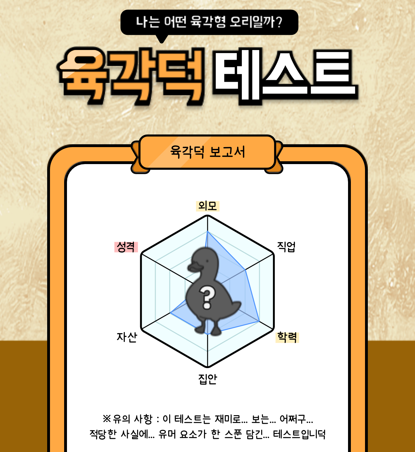 나는 어떤 육각형 오리일지 알아보는 ‘육각덕 테스트’라고 나왔는데 여러분들께 소개드리겠습니다.