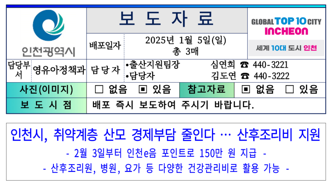 인천광역시(시장 유정복)는 오는 2025년 2월 3일부터 취약계층 산모를 대상으로 산후조리비 150만 원을 인천e음 포인트로 지원하는 ‘맘편한 산후조리비 지원사업’을 시작한다고 밝혔습니다.