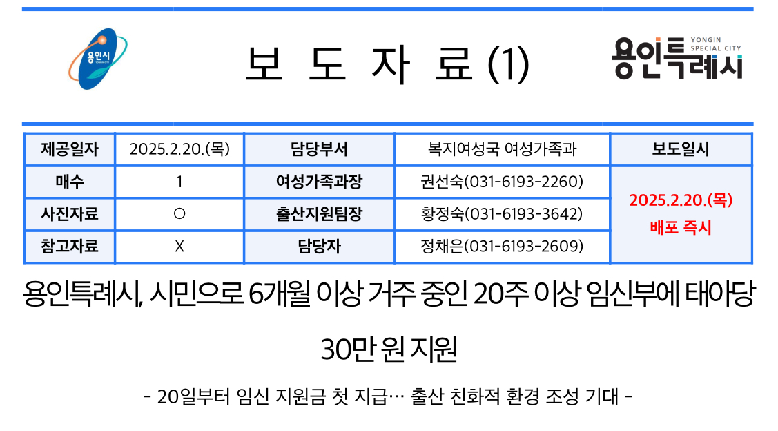 용인특례시(시장 이상일)는 출산 친화적 환경을 조성하고 저출생 문제에 적극 대응하기 위해 오는 2025년 2월 20일부터 용인에 주소지를 두고 6개월 이상 거주해 온 임신 20주 이상 임신부에게 태아 1명당 30만 원을 지역화폐로 지원한다고 밝혔습니다.