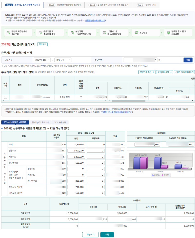 지난 연말정산 결과와 올해 2024년 1~9월 신용카드 사용액 기반으로 내년 2025년 연말정산 예상세액을 계산하는 서비스