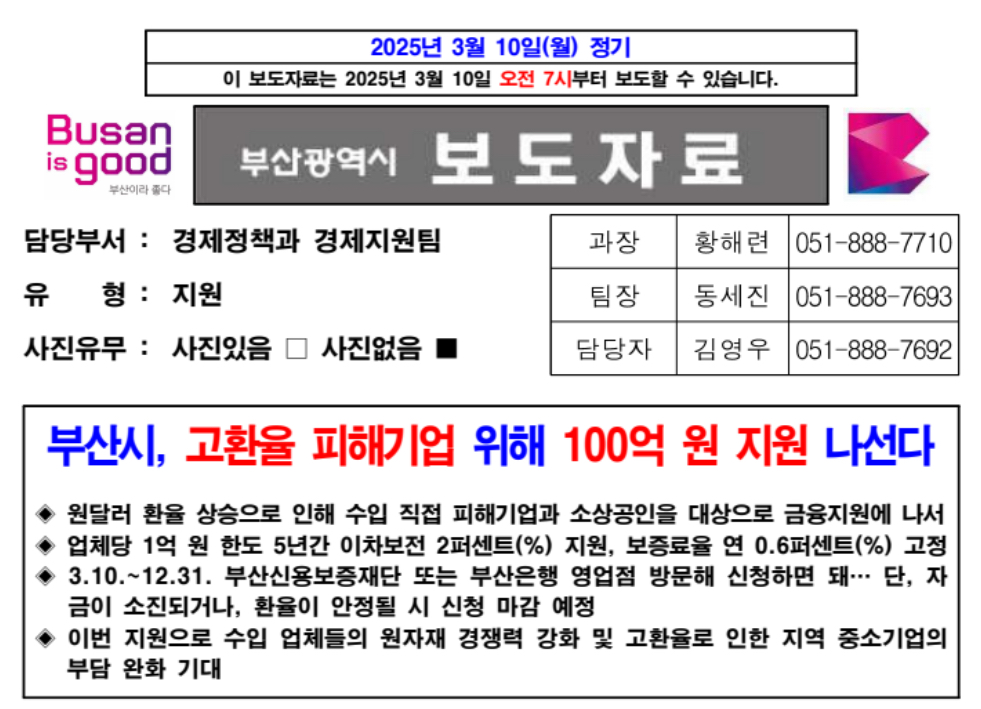 부산시(시장 박형준)는 부산신용보증재단과 함께 대외 경제 상황 악화에 따른 환율 상승으로 피해를 본 수입 기업과 소상공인을 위해 '고환율 피해기업 지원' 특별자금 100억 원을 지원한다고 밝혔습니다.