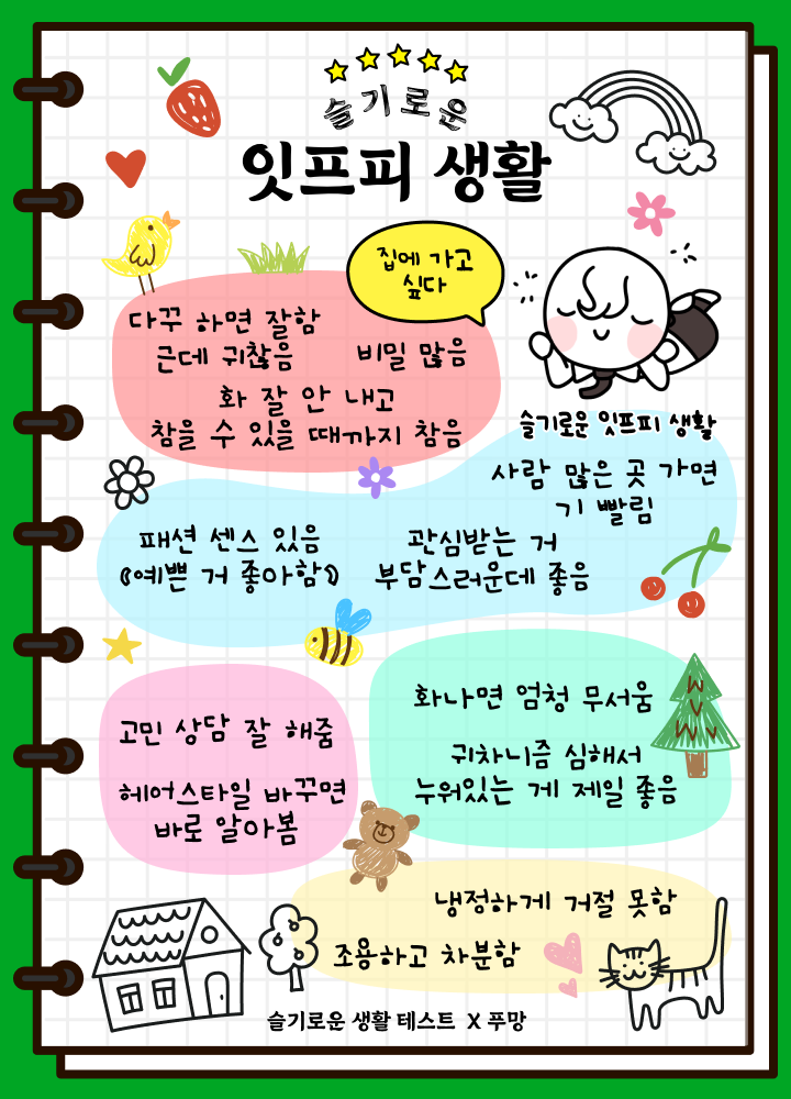 이름을 넣고 망이들의 일상을 확인해 보는 푸망에서 나온 ‘슬기로운 생활 테스트’를 소개드리겠습니다.
