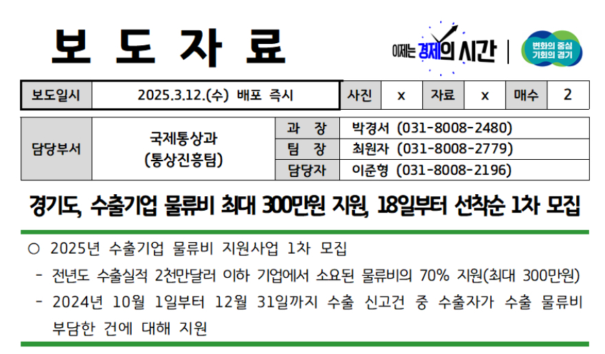 경기도가 ‘2025년 수출기업 물류비 지원사업’ 참여기업을 오는 2025년 3월 18일부터 25일까지 1차 모집한다고 합니다.