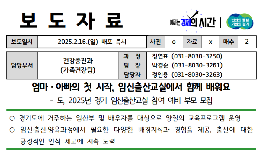 경기도가 초보 예비 엄마·아빠를 위한 경기 임신출산교실 프로그램 참여자를 모집한다고 밝혔습니다.