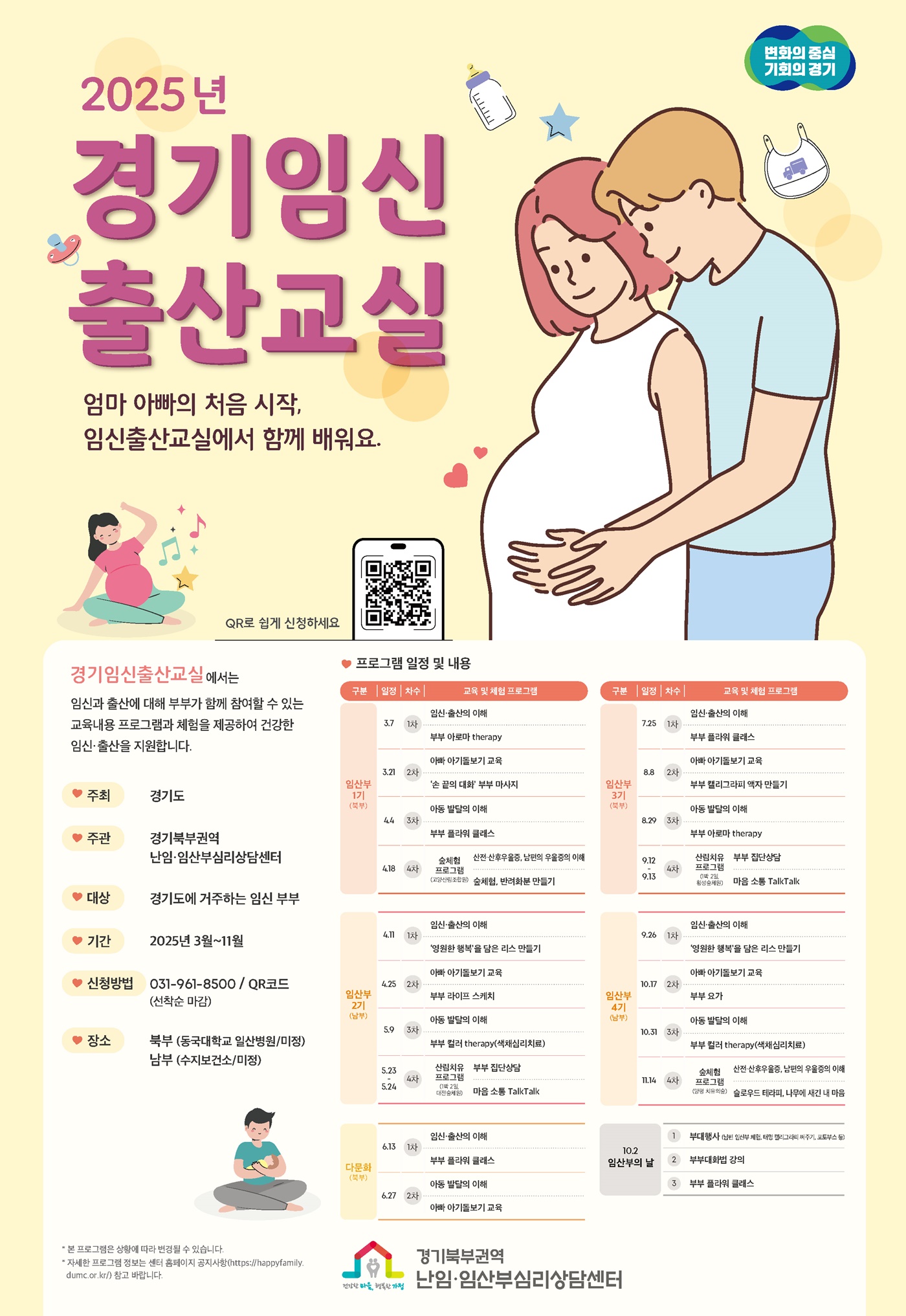 경기도는 2025년 3월부터 11월까지 경기도에 거주하는 임산부 및 배우자를 대상으로 ▲임신·출산과정의 이해 ▲태교, 아이발달 교육 ▲산전·산후우울증에 대한 이해 ▲산림치유 프로그램 등 다양한 교육프로그램을 개발해 운영할 예정이라고 합니다.