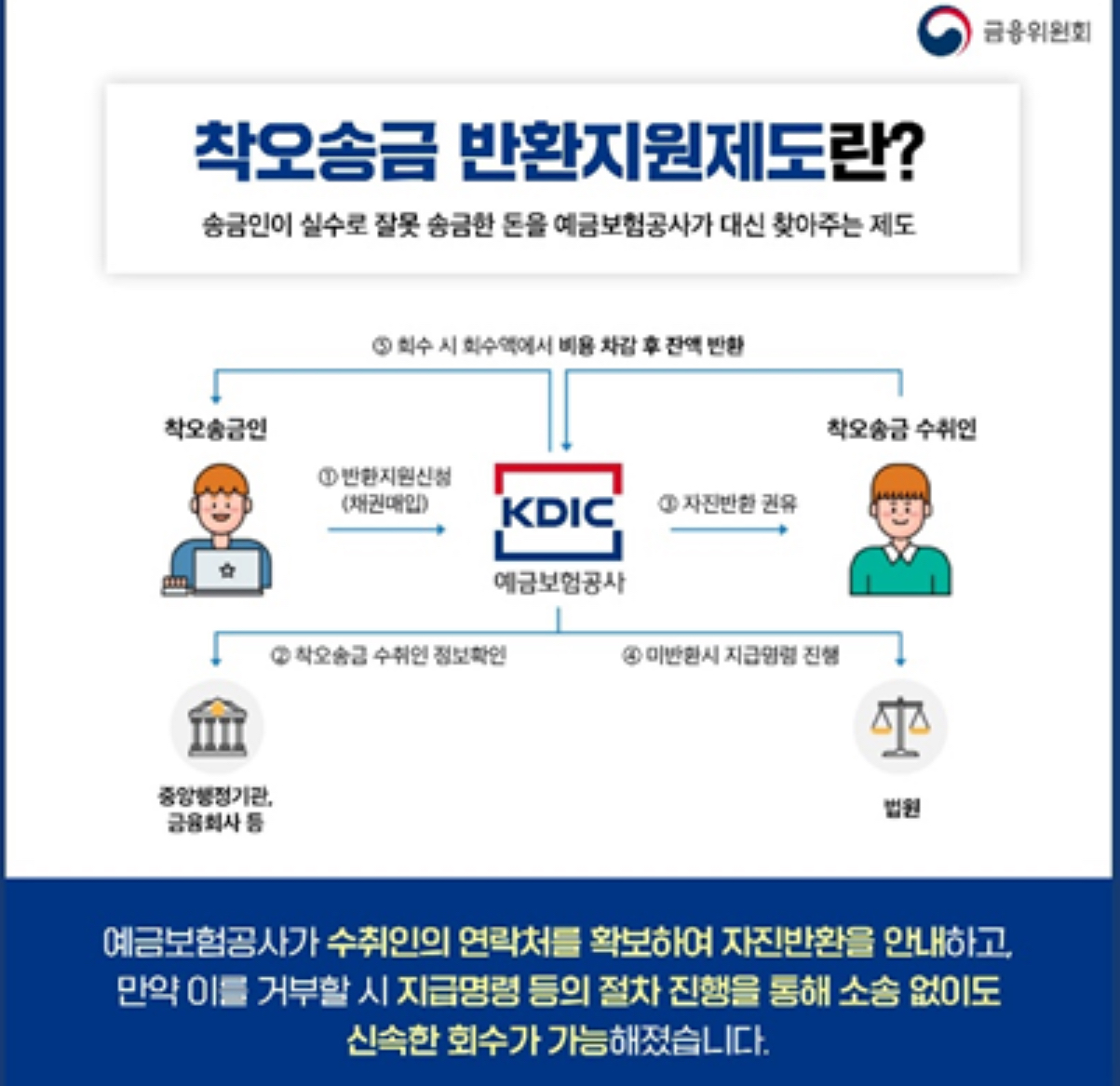 착오송금반환지원은 송금인이 실수로 잘못 송금한 돈을 예금보험공사가 대신 찾아주는 제도입니다.