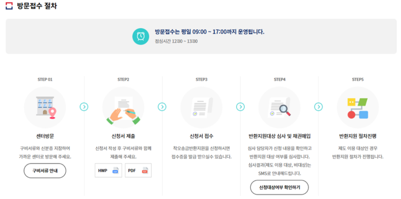 센터방문 신청서 제출 신청서 접수 반환지원대상 심사 및 채권매입 반환지원 절차진행 순으로 이루어집니다.