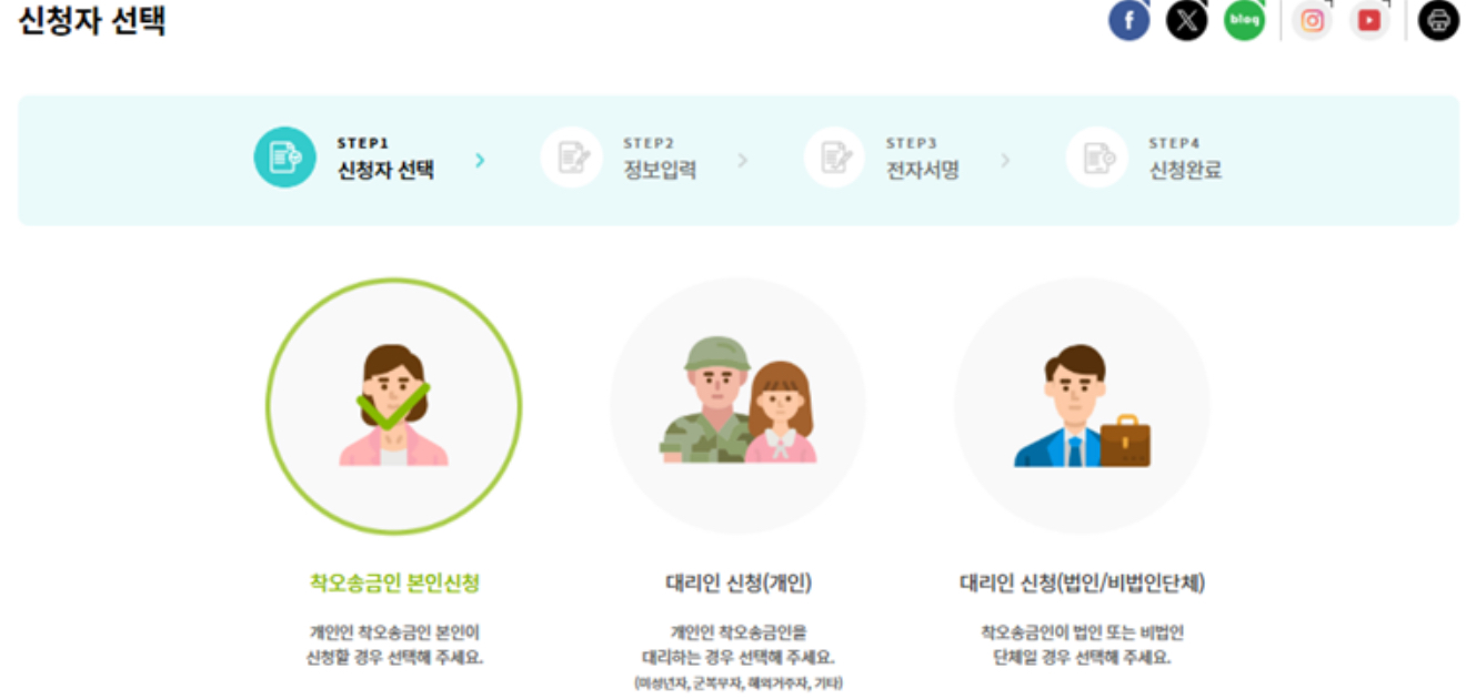 신청자 유형은 ▶착오송금인 본인 대리인 신청(개인) ▶대리인 신청(법인/비법인 단체)으로 구분되어 있습니다.