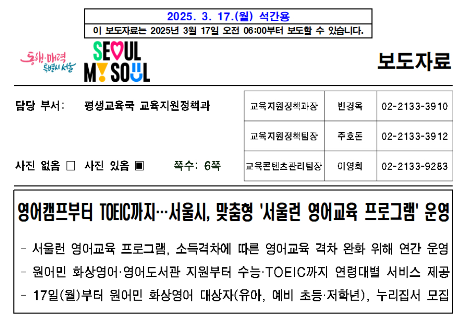 서울시에 따르면 ‘서울런 영어교육 프로그램 지원’이 시작되었다는데 여러분들께 빠른 정보를 공유드리고자 합니다.
