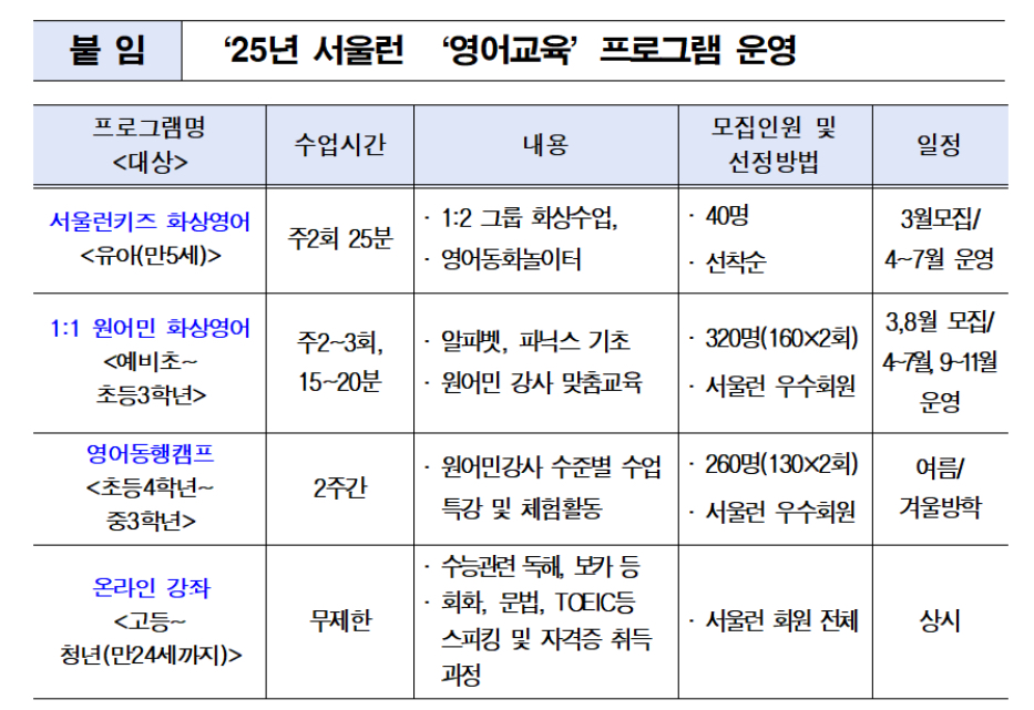 영어 학습 환경이 부족한 유아와 초등 저학년을 위해 만 5세 유아 40명을 대상으로 ‘서울런 키즈 화상영어’를 운영하고, 예비 초등학생부터 초등 3학년까지는 원어민과의 ‘1:1 화상영어’ 프로그램을 통해 기초 교육부터 맞춤형 학습을 제공한다고 합니다.