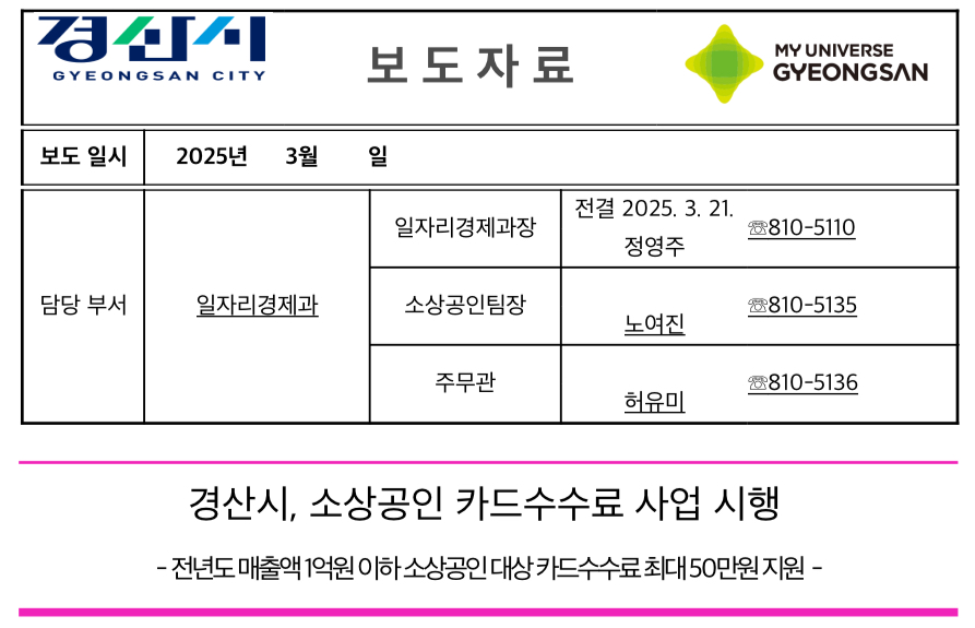 경산시(시장 조현일)는 오는 2025년 3월 24일부터 지역 소상공인의 경영 부담을 완화하고 실질적인 지원을 강화하기 위해 ‘소상공인 카드수수료 지원사업’을 시행한다고 밝혔습니다.