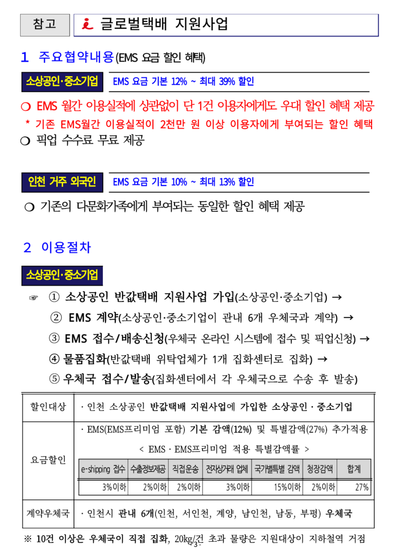 협약의 주요 내용은 인천시 소상공인과 중소기업이 EMS 월간 이용 실적에 상관없이 단 1건을 이용하는 경우에도 우대 할인* 혜택을 제공(기본 12%에서 최대 39%)하는 것입니다.