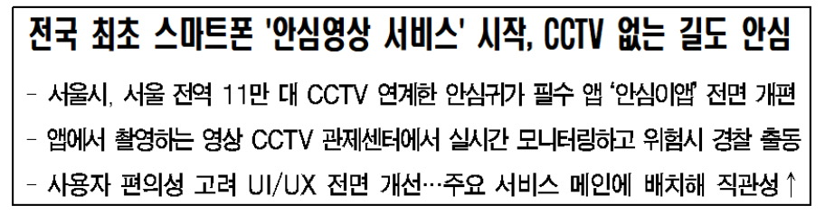 서울시는 불안한 귀갓길을 지켜주는 대표적인 안심귀가 필수 앱인 ‘안심이앱’을 전면 개편, ‘안심영상 서비스’를 시작했다고 밝혔습니다.