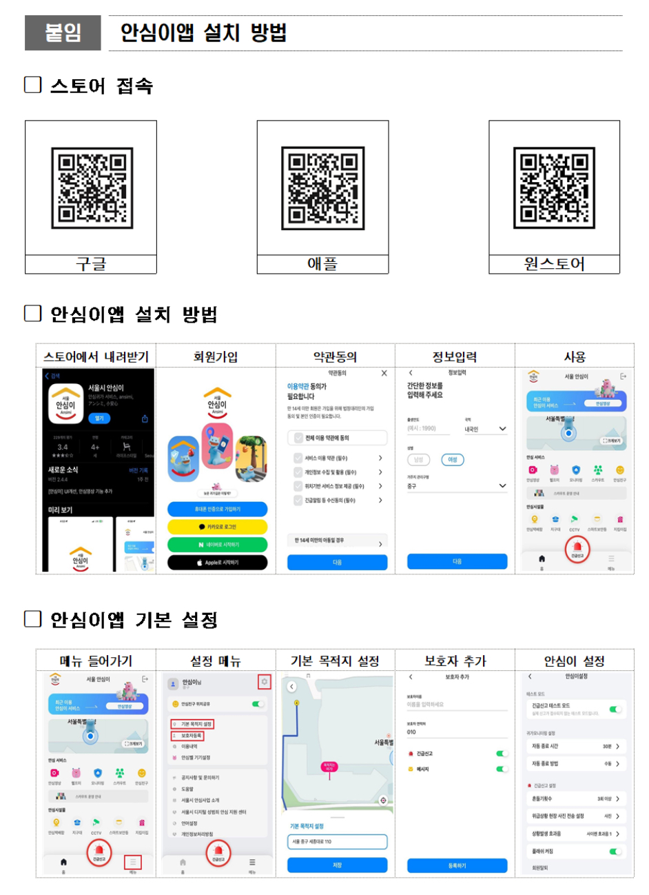 ‘안심이앱’은 플레이스토어, 앱스토어, 원스토어에서 ‘서울시 안심이’를 검색하거나 위 붙임자료 사진 QR코드를 통해 설치할 수 있으며, 연락처 및 이름만으로 손쉽게 가입해 이용할 수 있습니다.