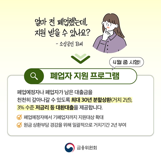 금융위원회에 따르면 맞춤형 채무조정 및 폐업자 지원 프로그램을 안내했는데 이에 자세한 소개드리겠습니다.
