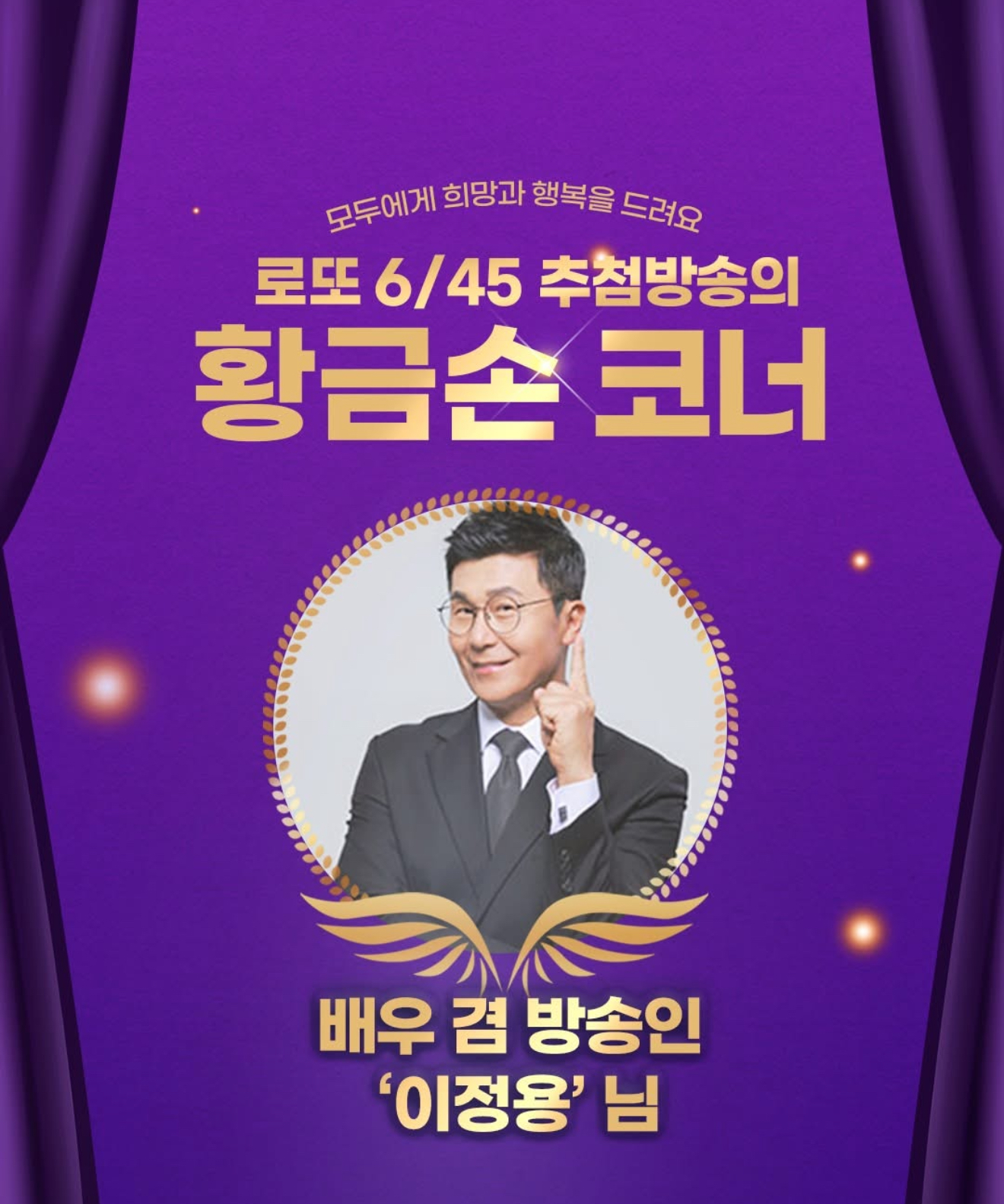 배우 겸 방송인 이정용이 1,166회 MBC ‘생방송 행복드림 로또 6/45’ 황금손으로 출연한다고 합니다.