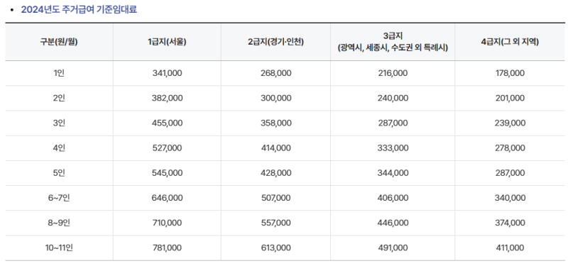 여러 조사 과정을 거쳐 만약 지원 대상자로 선정되면 신청 가구의 조건에 맞춰 실질적인 지원이 이루어지는데 임차급여의 경우, 거주 인원과 지역별 기준 임대료, 소득 인정액에 따라 1인 가구는 최소 17만 8천 원에서 최대 34만 1천 원의 임차료를 매달 지급받을 수 있습니다.