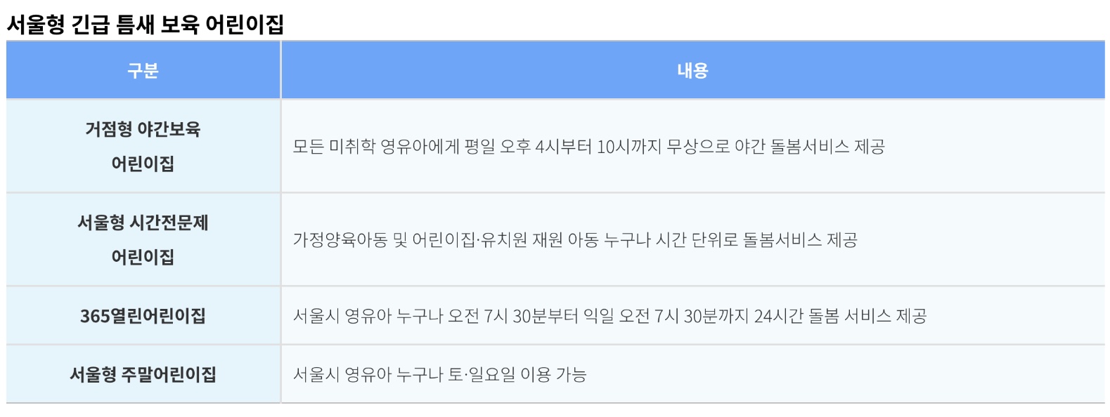 본 설명은 서울시 출처를 안내로 작성하였으며 서울시는 든든한 보육정책을 지원하고, 아이 키우기 좋은 보육특별시 서울을 통해 양육자가 믿고 맡길 수 있는 보육환경을 지속적으로 업그레이드해 나갈 계획이라고 합니다.