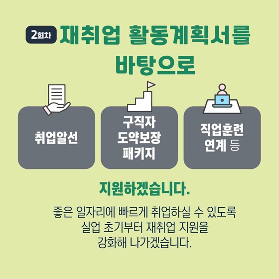 2회차 재취업 활동계획서를 바탕으로 취업알선·구직자 도약보장 패키지·직업훈련 연계 등 지원하겠습니다.