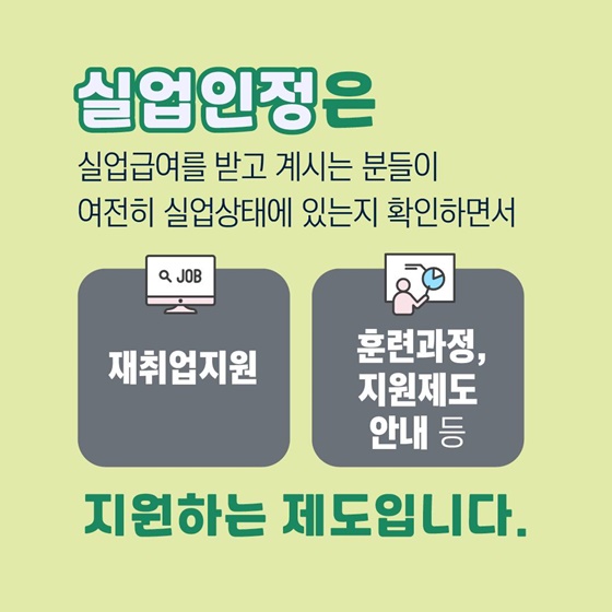실업인정은 실업급여를 받고 계시는 분들이 여전히 실업상태에 있는지 확인하면서 재취업지원, 훈련과정, 지원제도 안내 등 지원하는 제도입니다.