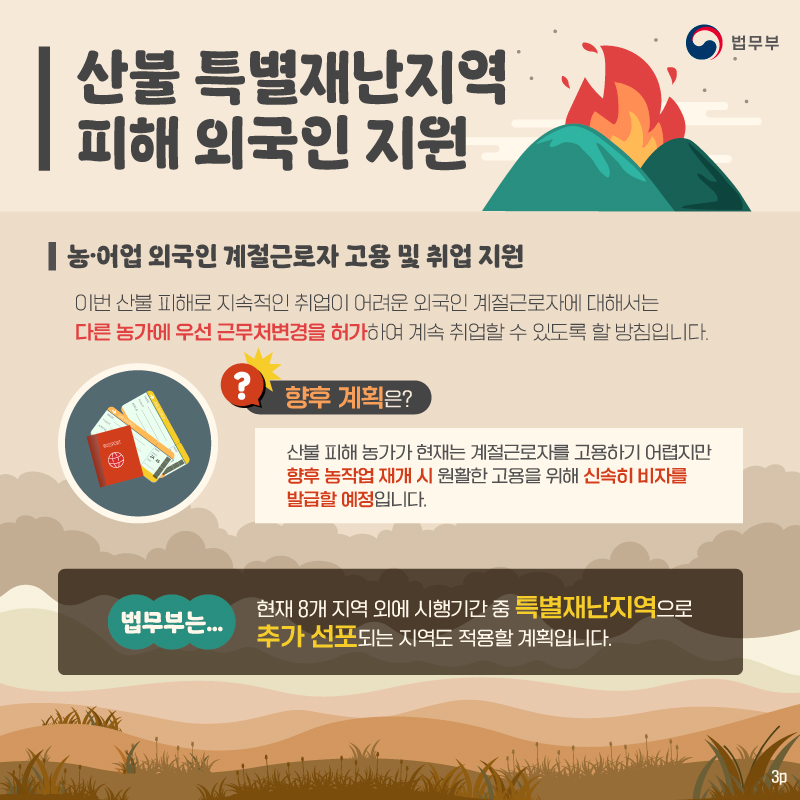 - 산불 피해 농가가 현재는 계절근로자를 고용하기 어렵지만 향후 농작업 재개 시 원활한 고용을 위해 신속히 비자를 발급할 예정이라고 합니다.