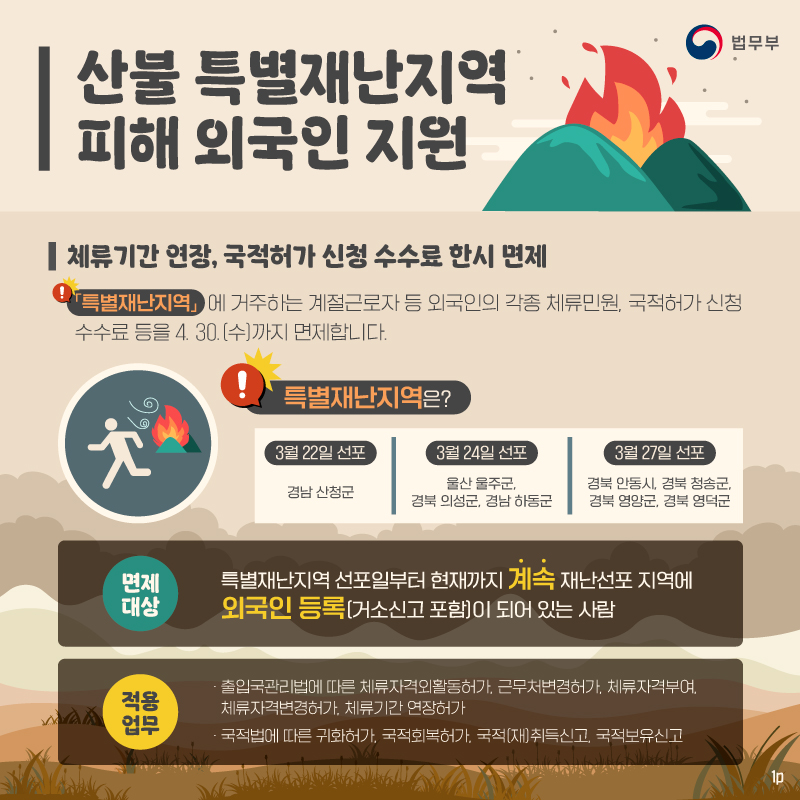 법무부는 최근 영남 지역 대형산불로 선포된「특별재난지역」*에 거주하는 계절근로자 등 외국인의 각종 체류민원, 국적허가 신청 수수료 등을 4. 30.까지 면제하기로 결정했습니다.