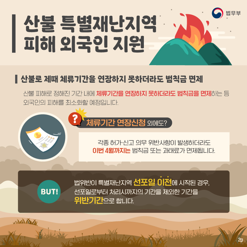 산불 피해로 정해진 기간 내에 체류기간을 연장하지 못하더라도 범칙금을 면제하는 등 외국인의 피해를 최소화할 예정이라고 합니다.