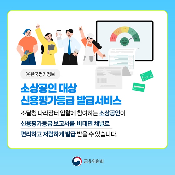 이에 따라, 조달 입찰에 참여하는 소상공인이 경영안정성을 증명하기 위해 제출하는 신용평가등급 보고서를 비대면 채널을 통해 편리하고 저렴하게 발급받을 수 있게 된다고 합니다.