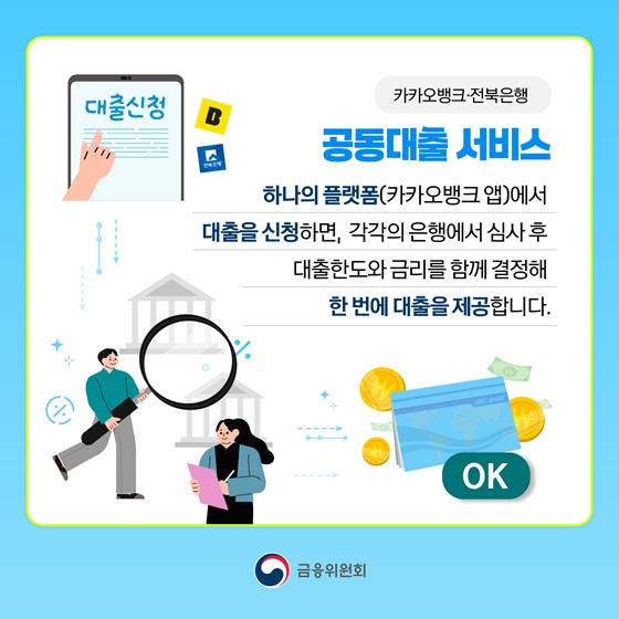 하나의 플랫폼(카카오뱅크 앱)에서 대출을 신청하면, 각각의 은행에서 심사 후 대출한도와 금리를 함께 결정해 한 번에 대출을 제공합니다.