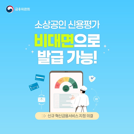 먼저, 금융위는 ㈜한국평가정보의 '소상공인 대상 신용평가등급 발급서비스'를 혁신금융서비스로 신규 지정했다고 합니다.