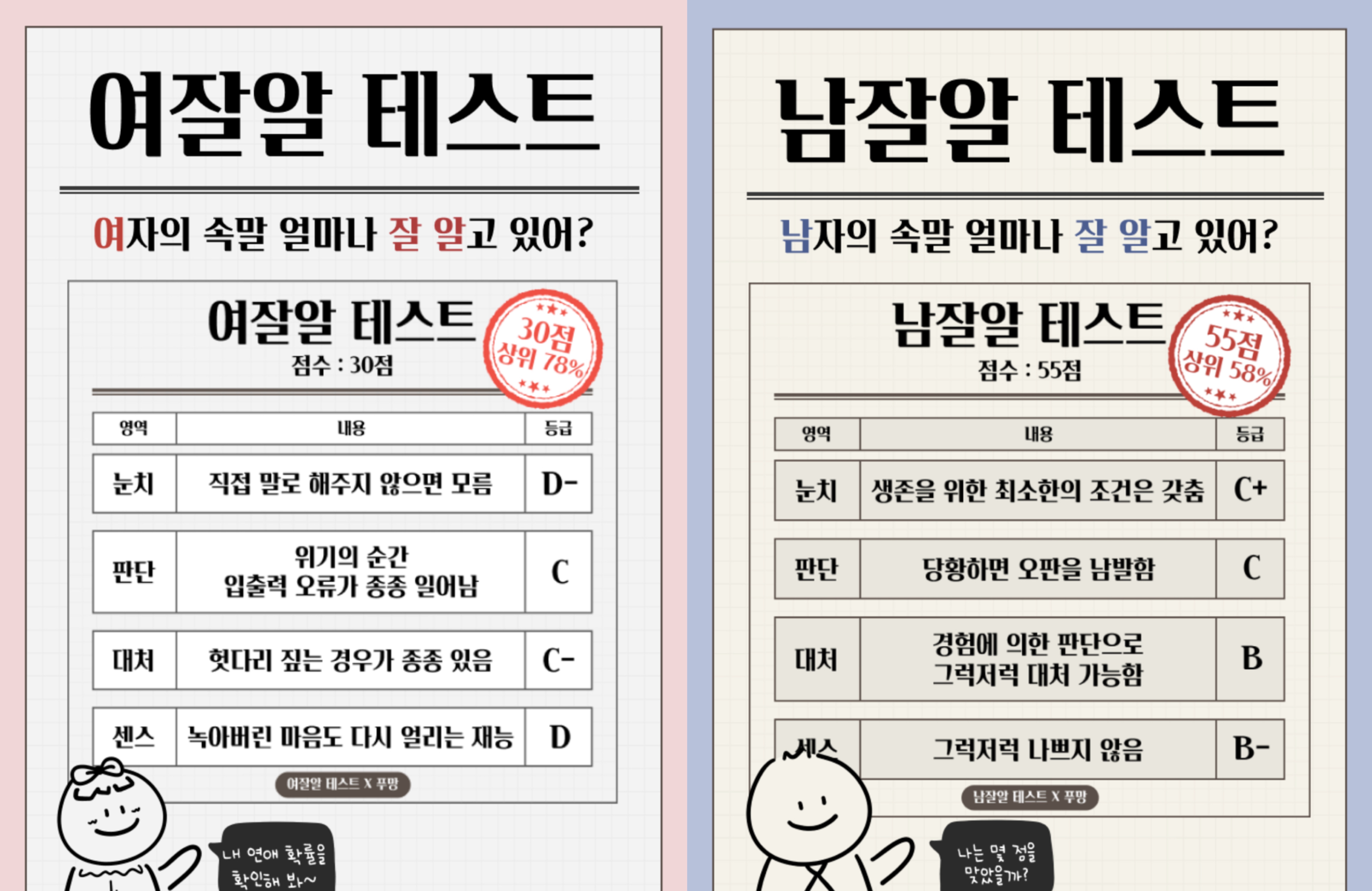푸망에서 ‘여잘알 테스트’와 ‘남잘알 테스트’가 나왔는데 여러분들께 소개드리겠습니다.