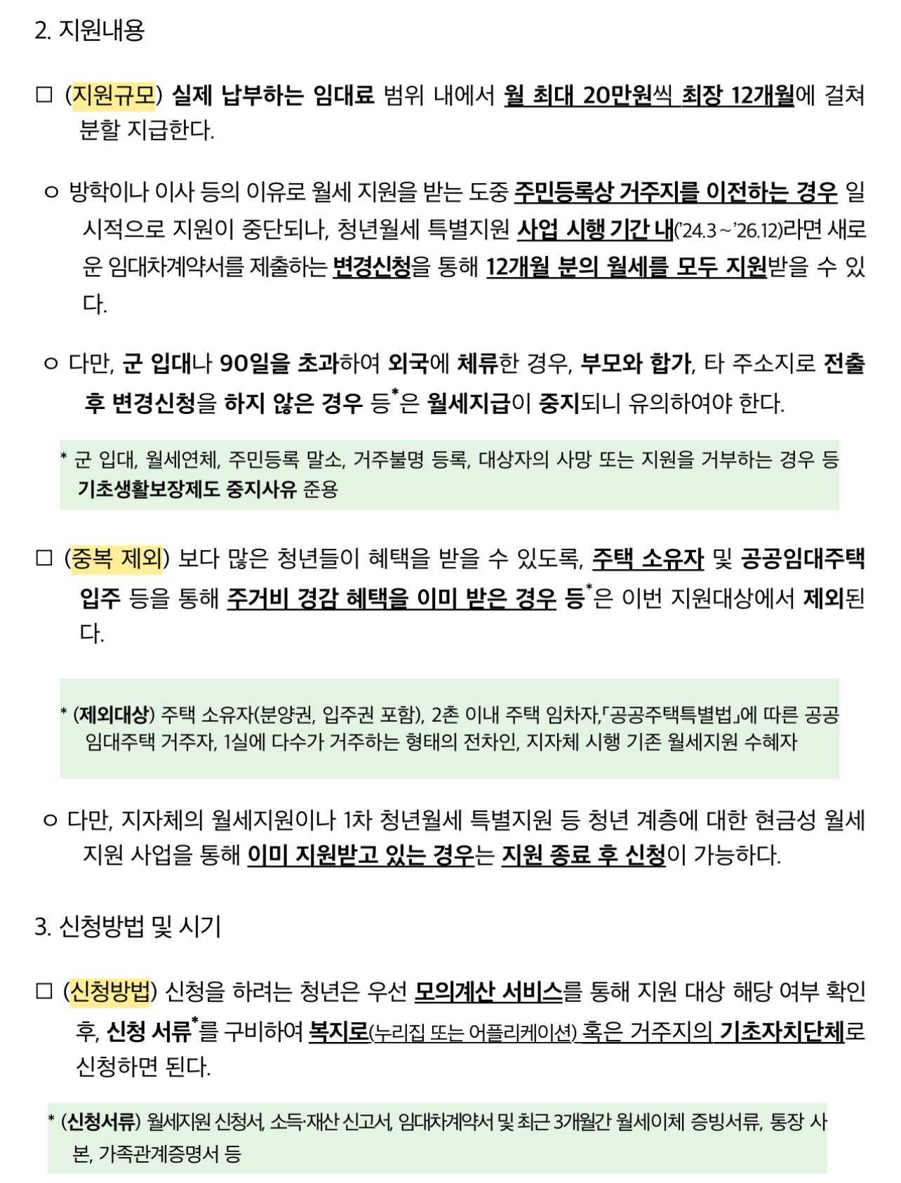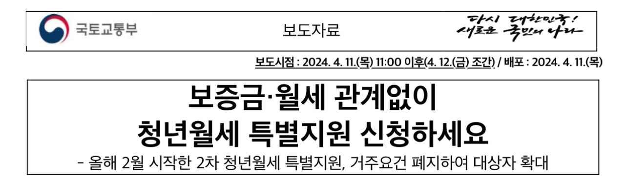 국토교통부(장관 박상우)는 더 많은 청년의 주거 부담을 완화하기 위해 “청년월세 특별지원” 사업의 거주요건을 폐지하고, 이를 반영하여 2024년 4월 12일(금)부터 신규 대상자 신청을 받는다고 밝혔습니다.