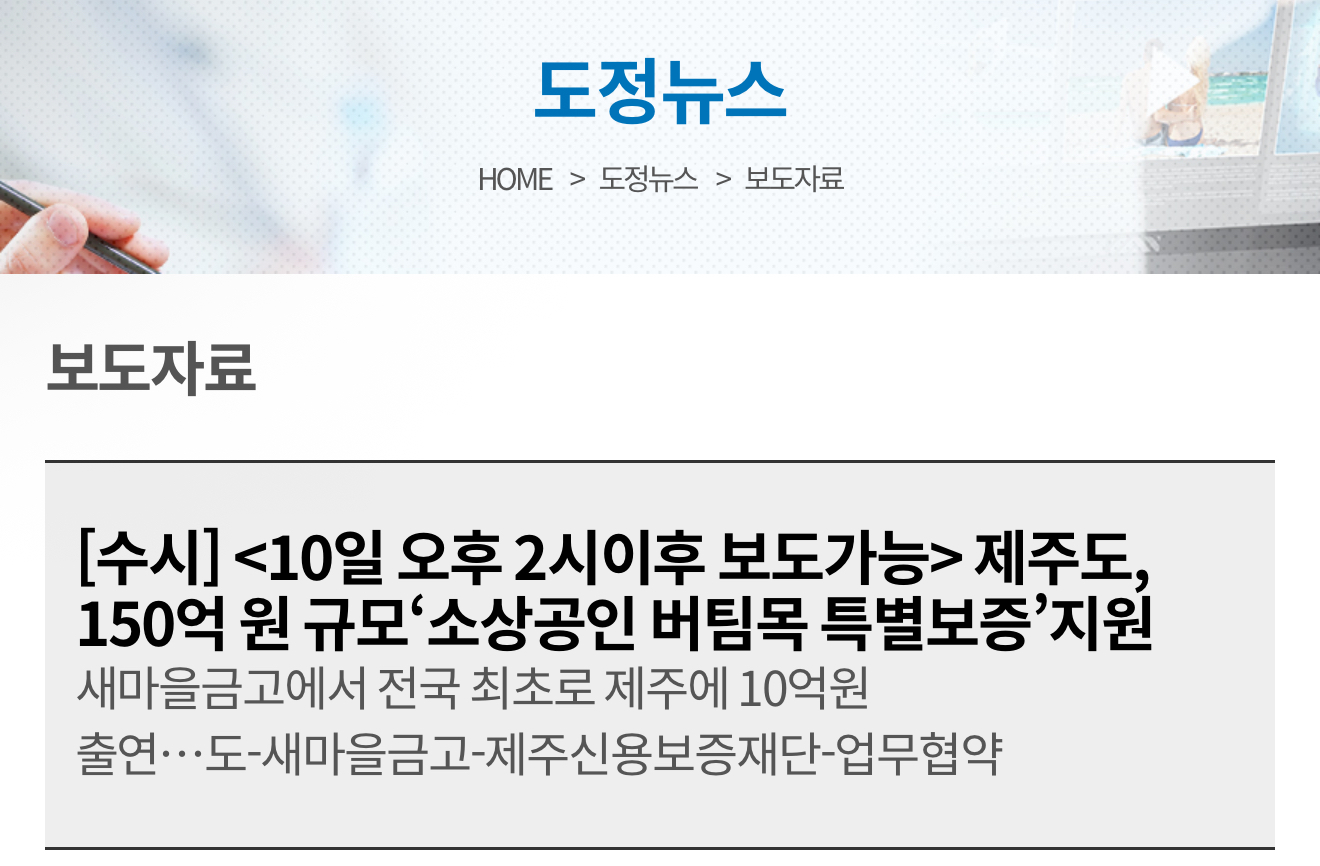 제주특별자치도가 새마을금고중앙회, 제주신용보증재단과 손잡고 도내 소상공인을 위한 150억 원 규모의 특별보증 지원에 나선다고 합니다.