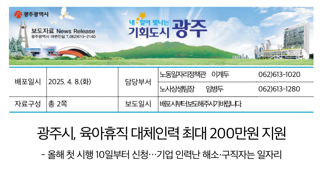 광주광역시 육아휴직 대체인력 지원 신청은 2025년 4월 10일부터 광주광역시 누리집에 신청 서류를 제출하면 된다. 서류심사 후 요건을 충족하는 근로자 200여 명에게 지원할 계획입니다.