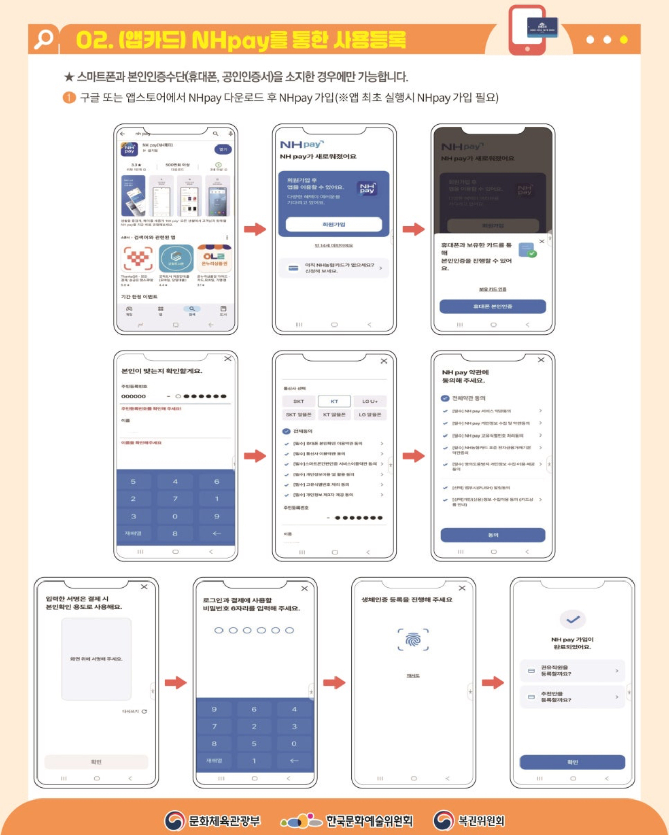 ➀ 앱스토어 또는 플레이스토어에서 NHpay 다운로드 후, NHpay 가입(앱 최초 실행 시 NHpay 가입 필요)