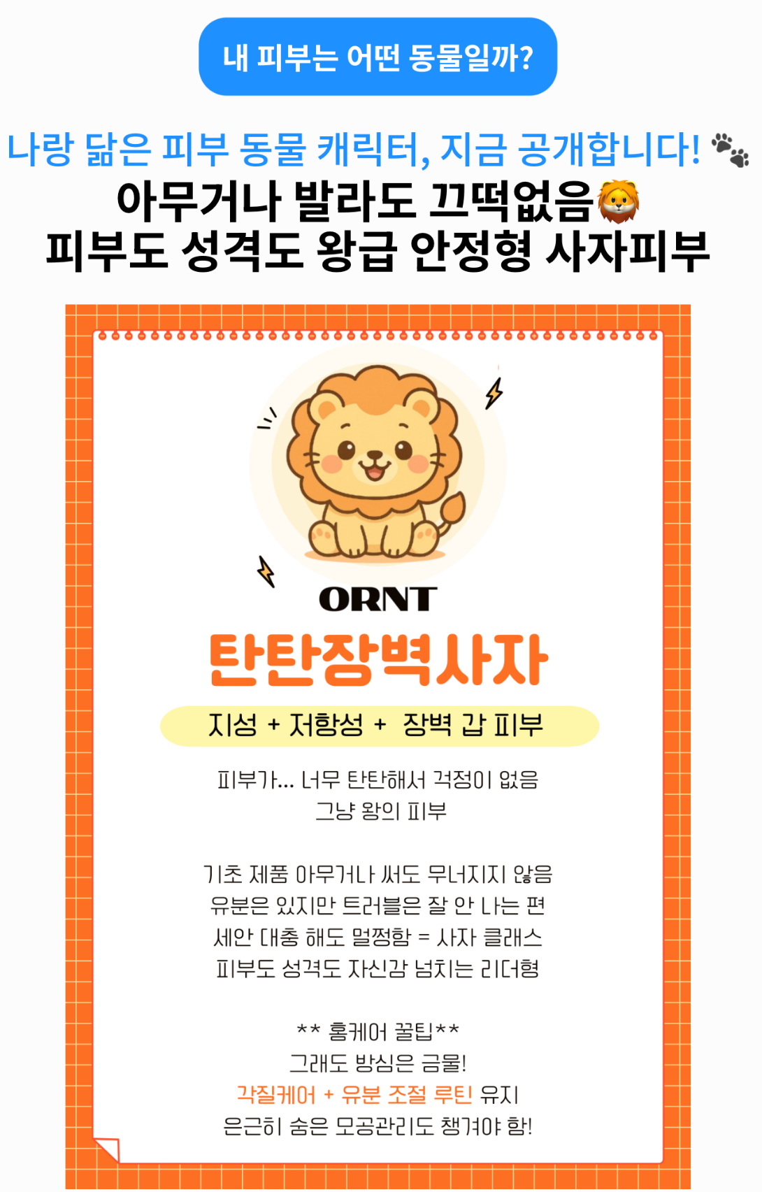 나랑 닮은 피부 동물 캐릭터는 아무거나 발라도 끄떡없음 피부도 성격도 왕급 안정형 사자피부가 나왔습니다.