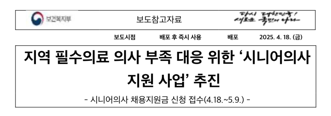 보건복지부(장관 조규홍)는 지역 필수의료 의사 부족 문제 해결의 대안으로 시니어의사 채용 활성화를 위해 2025년 「시니어의사 지원 사업」을 본격 추진한다고 합니다.