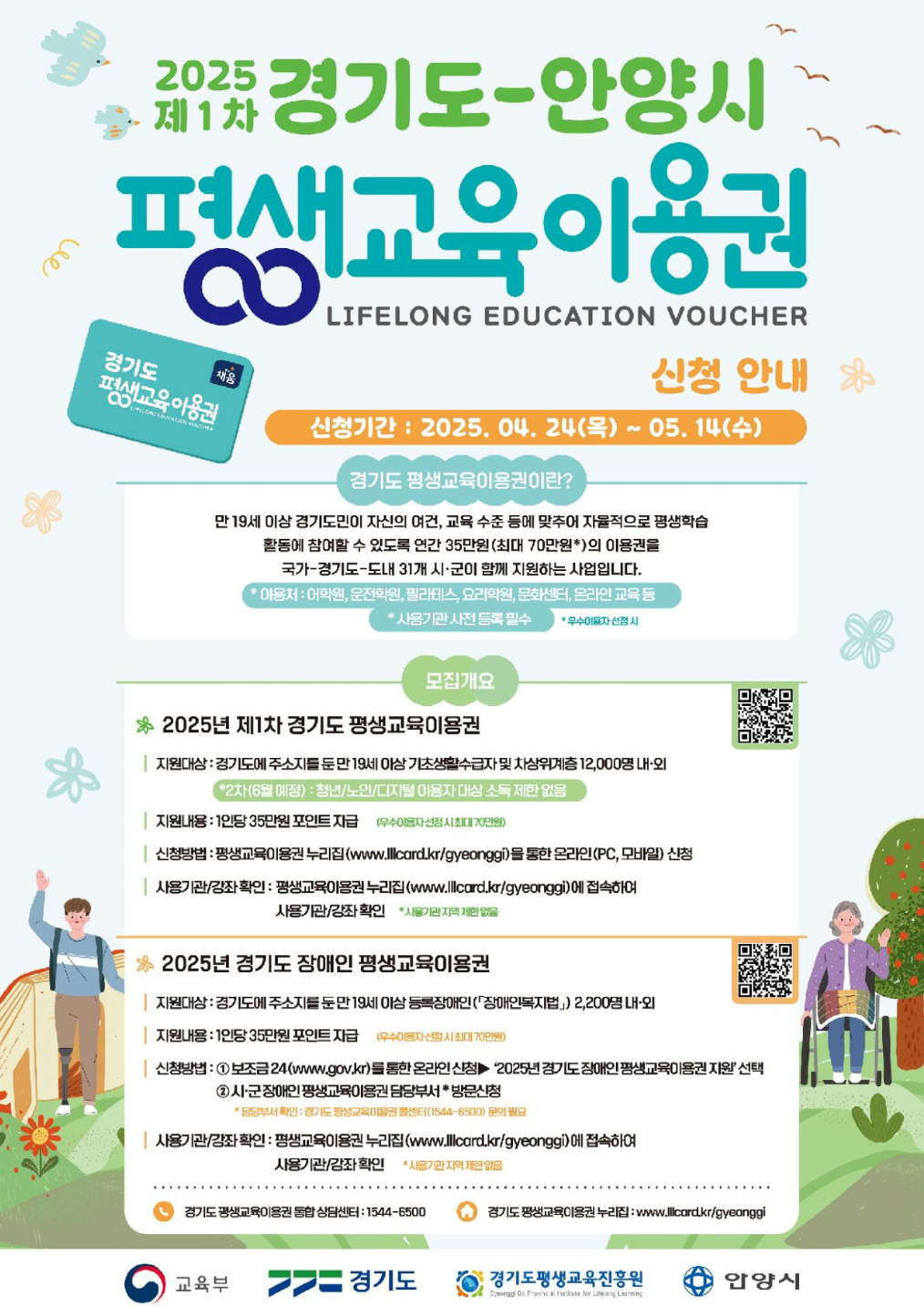 안양시 평생교육이용권 지원사업 1차 기간은 오는 2025년 4월 24일부터 5월 14일까지로 일반(저소득층)과 장애인 평생교육 이용권이 대상이며 일반 대상자는 평생교육 이용권 누리집(www.lllcard.kr/gyeonggi), 장애인 대상자는 보조금24(www.gov.kr)에서 온라인으로 신청할 수 있습니다.