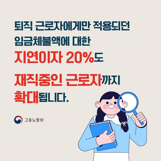 기존에는 퇴직 근로자에게만 적용되던 임금체불액에 대한 연 20%의 지연이자가 이제 재직 중인 근로자에게도 적용됩니다.