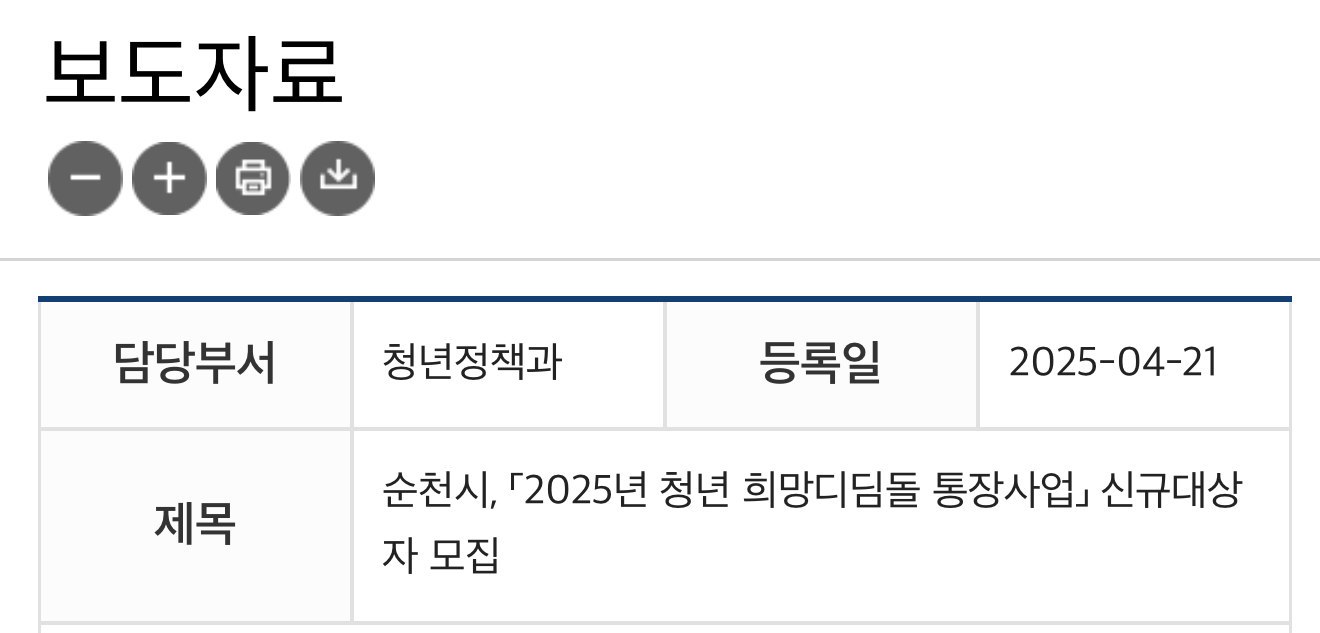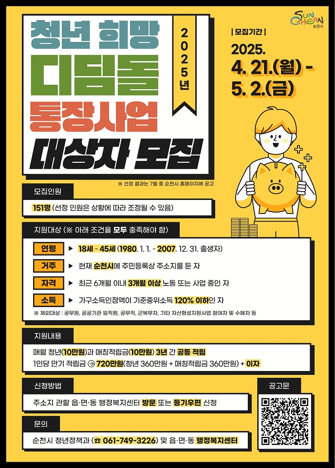 순천시(시장 노관규)는 2025년 ‘청년 희망디딤돌 통장사업’ 신규대상자를 2025년 4월 21일부터 5월 2일까지 2주간 모집한다고 합니다.