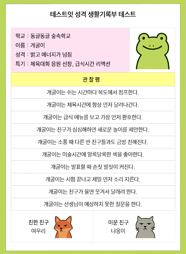 테스트잇이라는 사이트에서 ‘성격 생활기록부 테스트’라고 나왔는데 여러분들께 소개드리겠습니다.