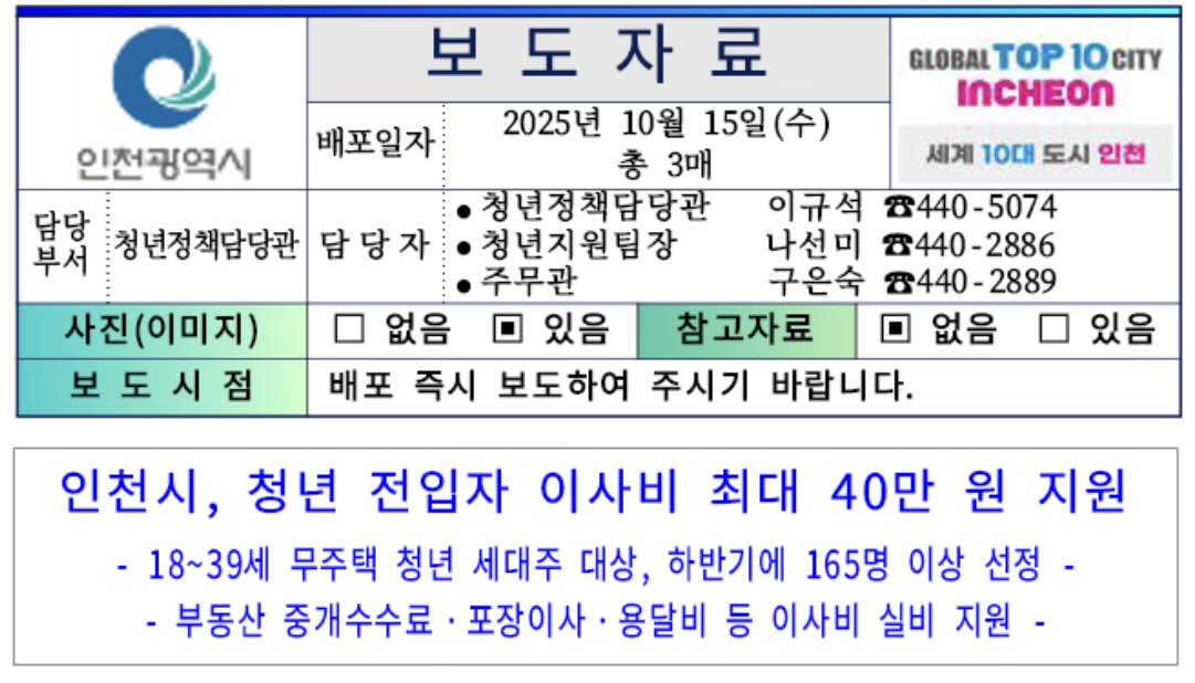 인천광역시(시장 유정복)는 인천으로 전입하는 청년들의 주거비 부담을 완화하고 지역사회에 안정적으로 정착할 수 있도록, 상반기에 이어 하반기에도 최대 40만 원의 이사비를 지원한다고 밝혔습니다.